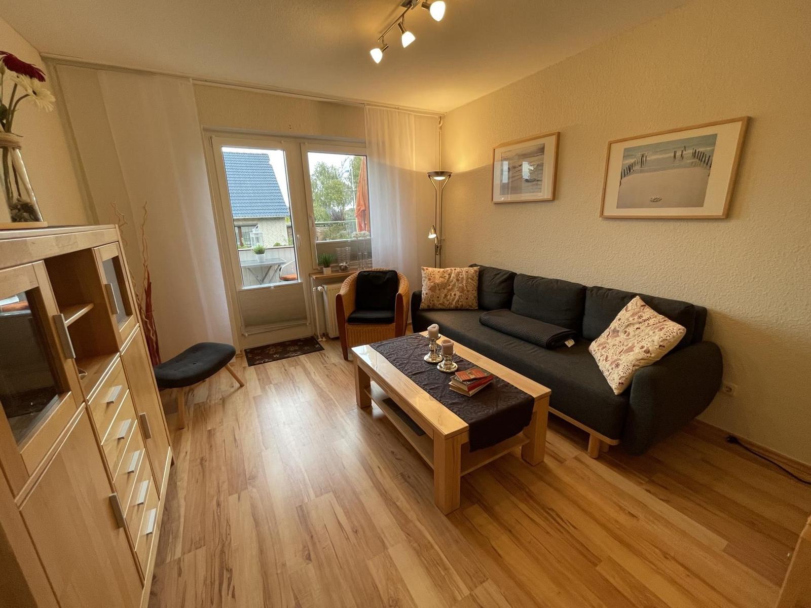 2-Zimmer Wohnung bis zu 4 Personen über 50m², Wohnzimmer mit gemütlicher Sitzgruppe, große Doppelbettcouch, TV, Stereoanlage, DVD, Wlan, separate Küche mit Geschirrspüler und Essplatz, Flur mit Garderobe, Schlafzimmer mit Doppellbett, Dusche/WC, möblierter Balkon, PKW-Stellplatz