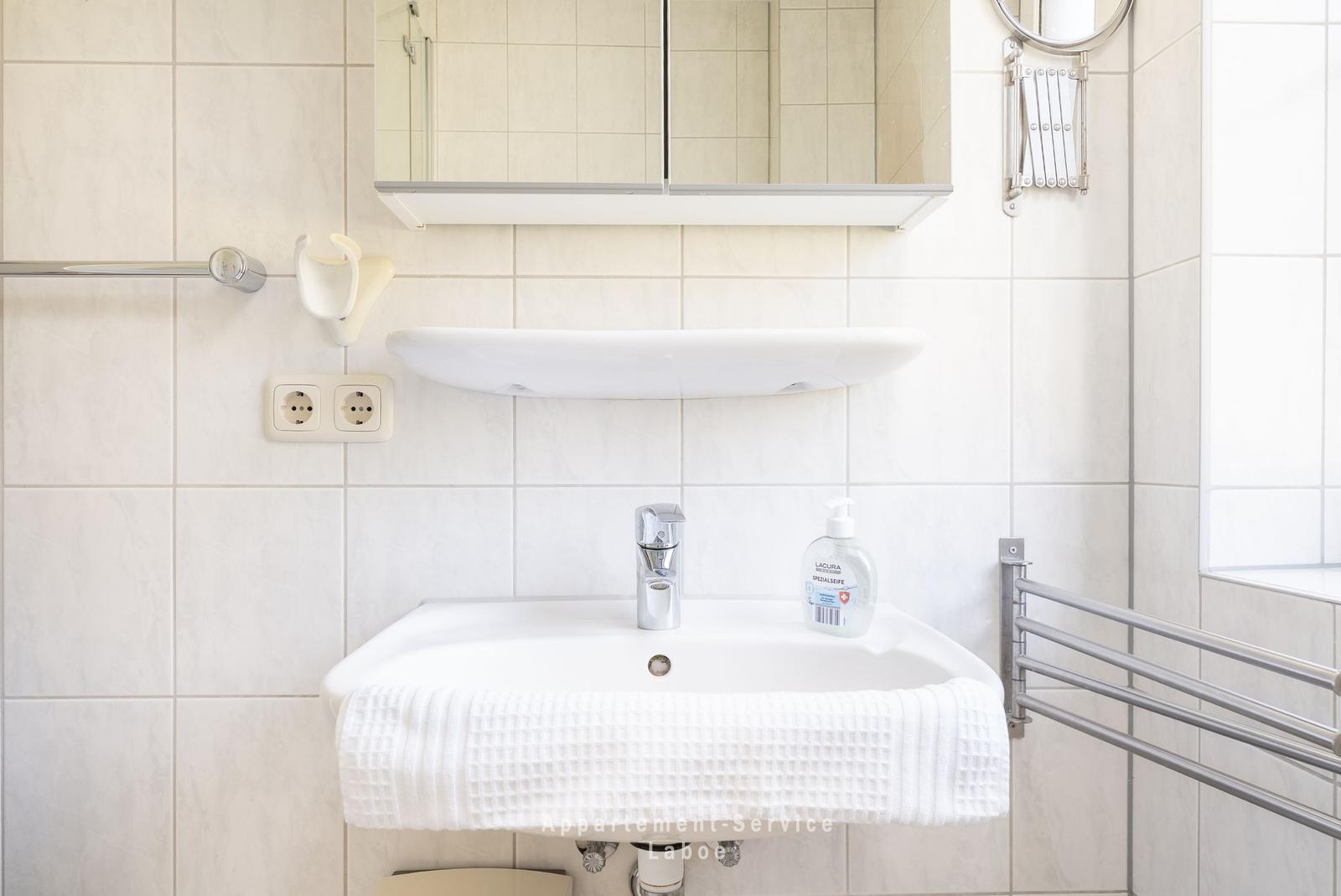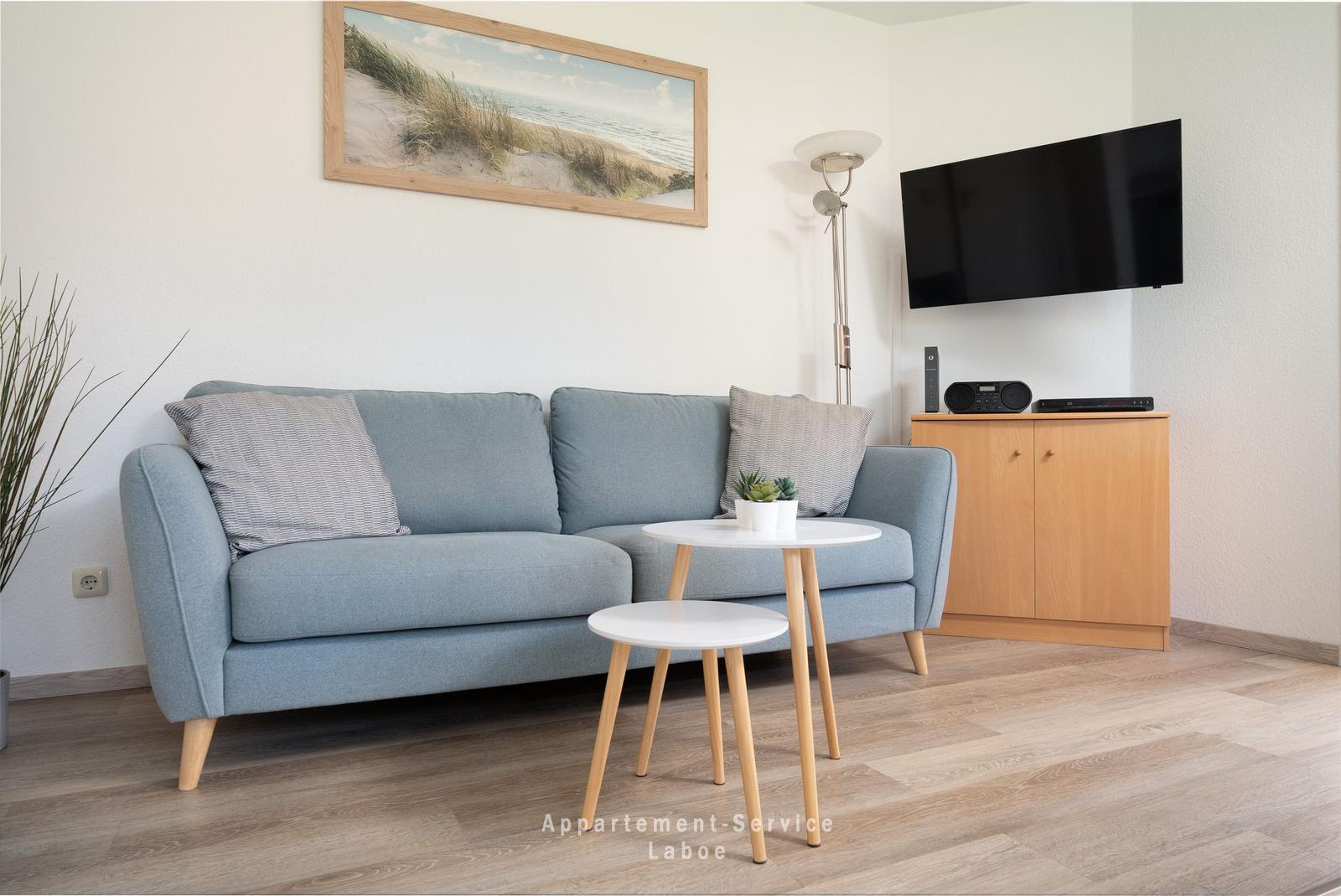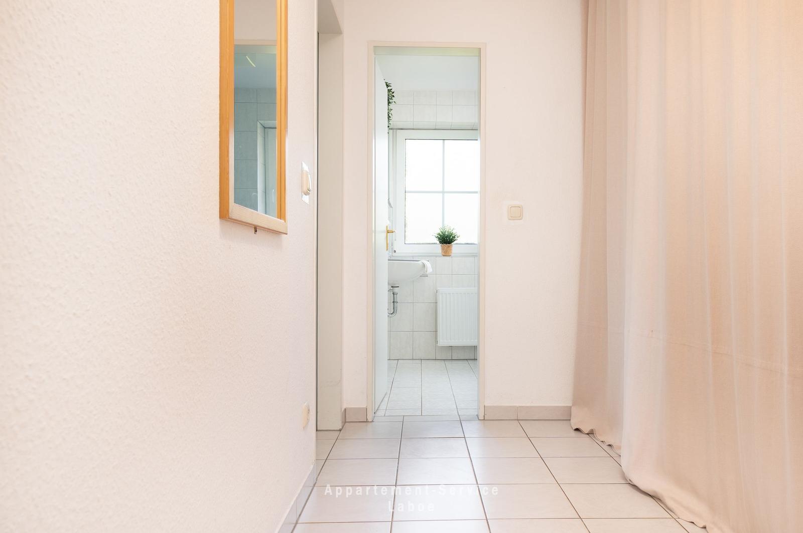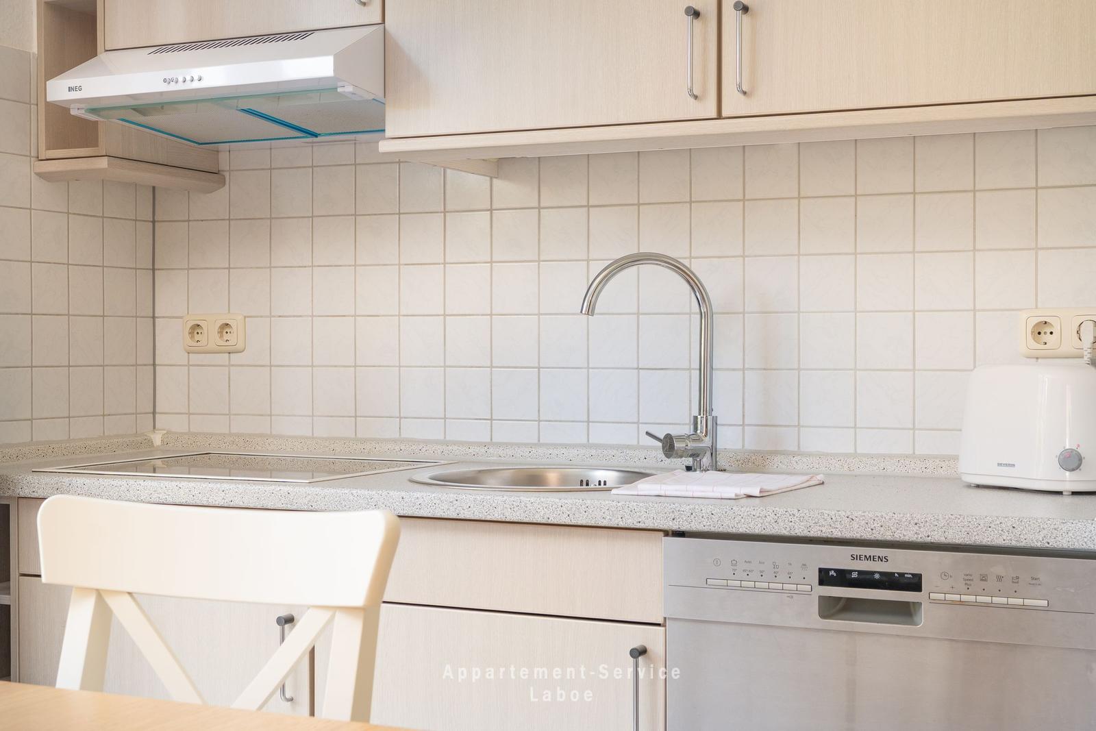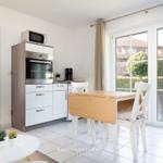2-Zimmer Wohnung bis zu 4 Personen über 40m², kombiniertes Wohnschlafzimmer mit gemütlicher Sitzgruppe (Doppelbettcouch), TV, Stereoanlage, Wlan, volleingerichtete Küche mit Essplatz, kleiner Flur mit Garderobe, Dusche/WC, Schlafzimmer mit Doppelbett, möblierte Terrasse, PKW-Stellplatz in der Tiefgarage mit Doppelparkanlage (max. Höhe 1,50m)